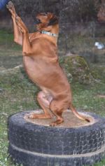 'Riddick Cedarrose Jumping Jak Flash & 'Rosie'Cedarrose Brown Sugar litter brother & sister (Ch Elangeni Just Shameless x Ch Cedarrose Dixie Chick)Riddick trying to impress his sister. Riddick is owned by Luke & Trudy and Rosie is owned by Viv and family.